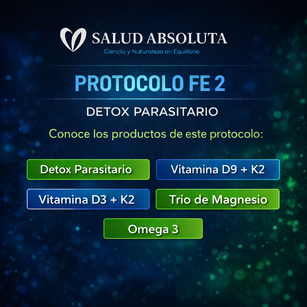 | Detox Parasitario | 60 ml líquido | Tomar en agua durante almuerzo y cena por 21 días. Iniciar en luna nueva. Repetir mensualmente por 2 años. |